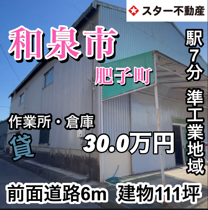 【トラック横付け可能 倉庫・作業所 事務所有り 建物111坪 和泉市 第二阪和道路入ってすぐ】