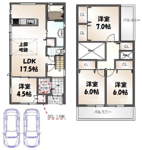 リビングに大きな吹き抜け、玄関に大容量シューズクローク付き