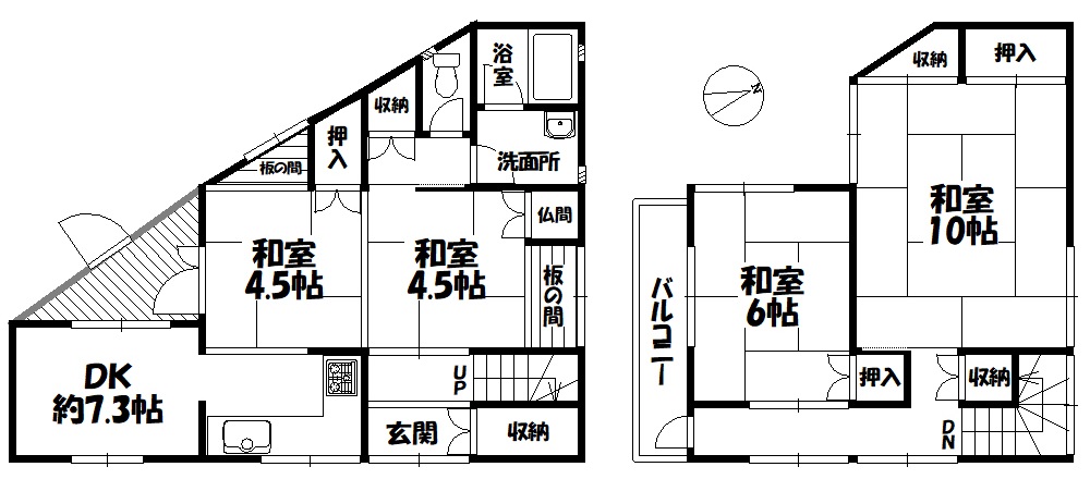 | 間取り | 4DK (1階DK7.3畳 1階和室4.5畳 1階和室4.5畳 2階和室10畳 2.階和室6畳 ) |